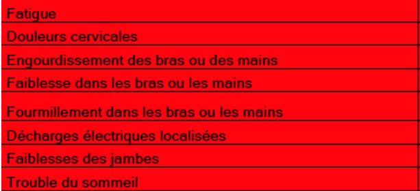 Divers symptômes peuvent alors apparaître, mais ils varient fortement d’un malade à l’autre. Les symptômes les plus courants sont insensibilité à la chaleur, des douleurs, une faiblesse des membres, des troubles de la marche, mais aussi des troubles sphinctériens et de la fonction sexuelle, des troubles neurovégétatifs (sudation).